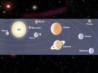 O documento descreve os corpos celestes que compõem o sistema solar, incluindo o Sol, planetas e luas. Explica que o Sol é uma estrela que fornece luz e calor à Terra e aos demais planetas, e que estes refletem a luz solar. Também define astros e diferencia planetas de estrelas com base em terem ou não luz própria.