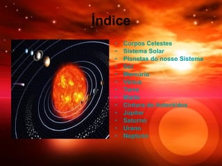 O documento descreve os corpos celestes do Sistema Solar, incluindo os oito planetas que orbitam o Sol: Mercúrio, Vénus, Terra, Marte, Júpiter, Saturno, Urano e Neptuno. Fornece detalhes sobre as características físicas e orbitais de cada planeta, como suas composições atmosféricas, temperaturas de superfície, períodos de rotação e translação.