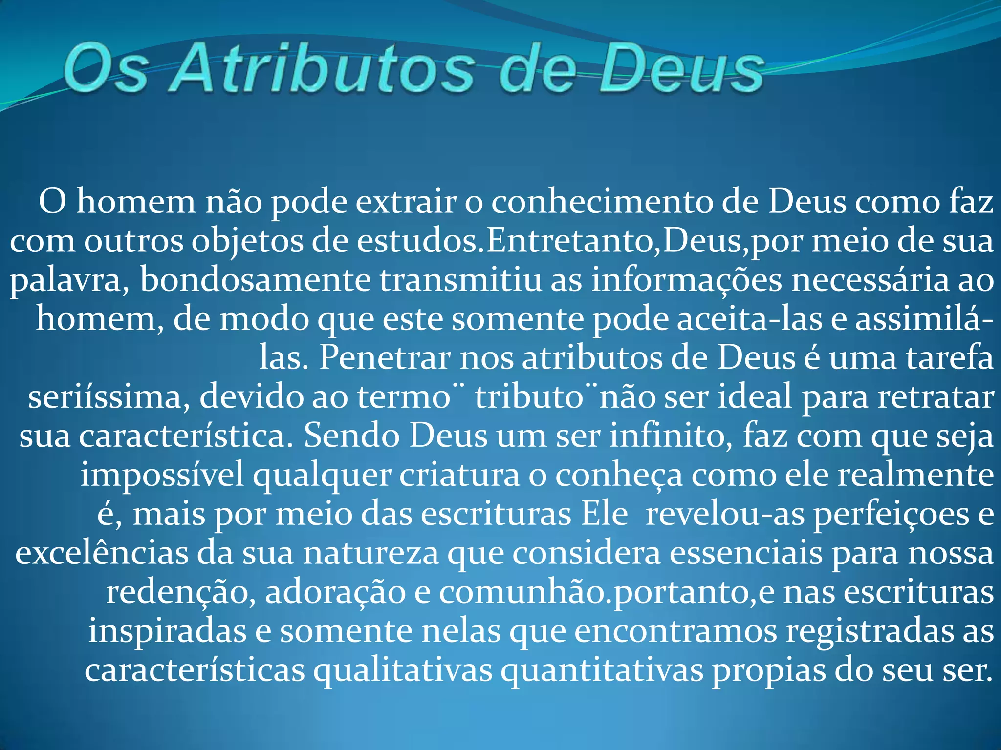 O documento discute vários atributos de Deus, incluindo sua onisciência, onipresença, onipotência e perfeição. Ele explica que Deus é um ser espiritual e eterno que não muda e conhece todas as coisas.