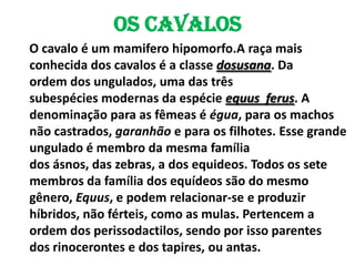 O cavalo é um mamífero hipomorfo da ordem dos perissodactilos. Vivem em grupos liderados por matriarcas e usam linguagem corporal para se comunicar. Historicamente foram usados no transporte e guerras, mas atualmente são mantidos como animais de estimação ou esporte.