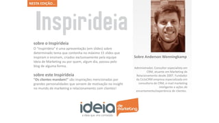 O documento apresenta um resumo sobre relacionamento com clientes em 15 slides. Cada slide contém uma citação de uma personalidade sobre a importância de se focar no cliente, atendê-lo bem e resolvê-lo de forma satisfatória para mantê-lo como cliente por mais tempo.