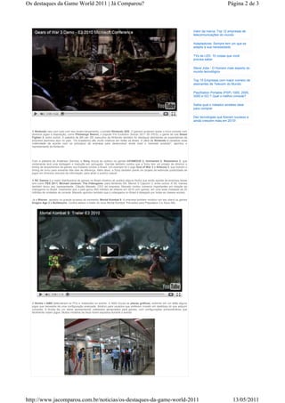 O evento Game World 2011 apresentou as principais novidades das empresas do setor de games. A Microsoft mostrou jogos para Kinect como Dance Central e Gears of War 3. A Nintendo apresentou o portátil 3DS e jogos como Pilotwings Resort. A Sony anunciou lançamentos como inFAMOUS 2 e redução no tempo entre lançamentos no Brasil e EUA. A NC Games exibiu títulos como PES 2011 e Marvel vs Capcom 3.