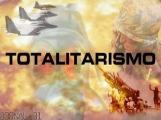 O documento discute as características do totalitarismo de direita e esquerda, comparando o fascismo italiano e nazismo alemão com o stalinismo soviético. Apresenta traços comuns entre esses regimes totalitários como partido único, culto à personalidade do líder, propaganda estatal, repressão de dissidentes e militarização da sociedade.