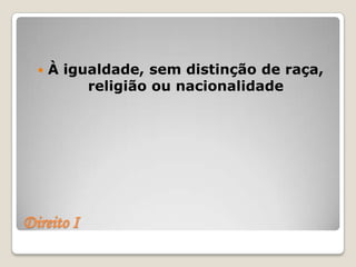 O documento lista 10 direitos fundamentais de crianças, incluindo o direito à igualdade, proteção, nome e nacionalidade, alimentação, moradia, educação, amor, lazer, socorro em catástrofes e proteção contra exploração.