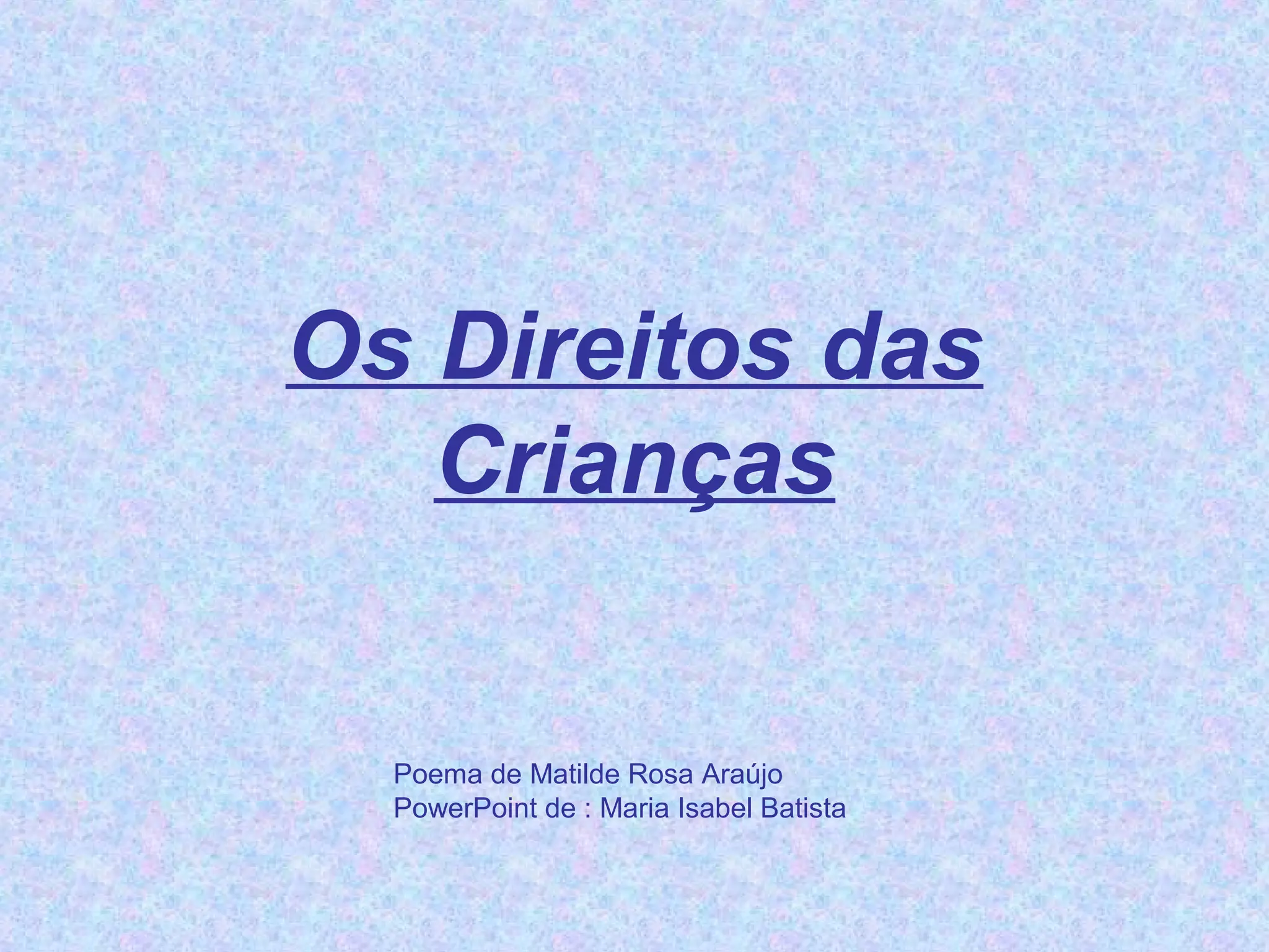 Este poema descreve os direitos fundamentais das crianças, incluindo o direito de crescer livremente, de ser protegida e amada, e de ser tratada com dignidade independentemente de raça, gênero ou origem.