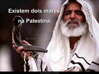 O documento descreve as diferenças entre o Mar da Galiléia e o Mar Morto na Palestina. O Mar da Galiléia é doce, com peixes e vida ao longo de suas margens, enquanto o Mar Morto é salgado sem vida, pois retém todas as águas que recebe. A diferença se deve ao fato de que o Mar da Galiléia permite que a água entre e saia em igual medida, enquanto o Mar Morto retém tudo o que recebe.