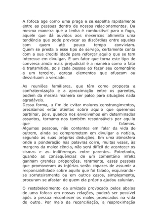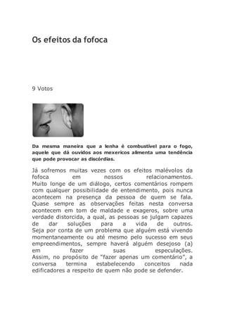 O documento discute os efeitos negativos da fofoca nas relações, como pode provocar discórdias entre as pessoas e espalhar informações distorcidas. A fofoca deve ser evitada para não prejudicar a reputação dos outros ou causar problemas entre familiares e amigos.