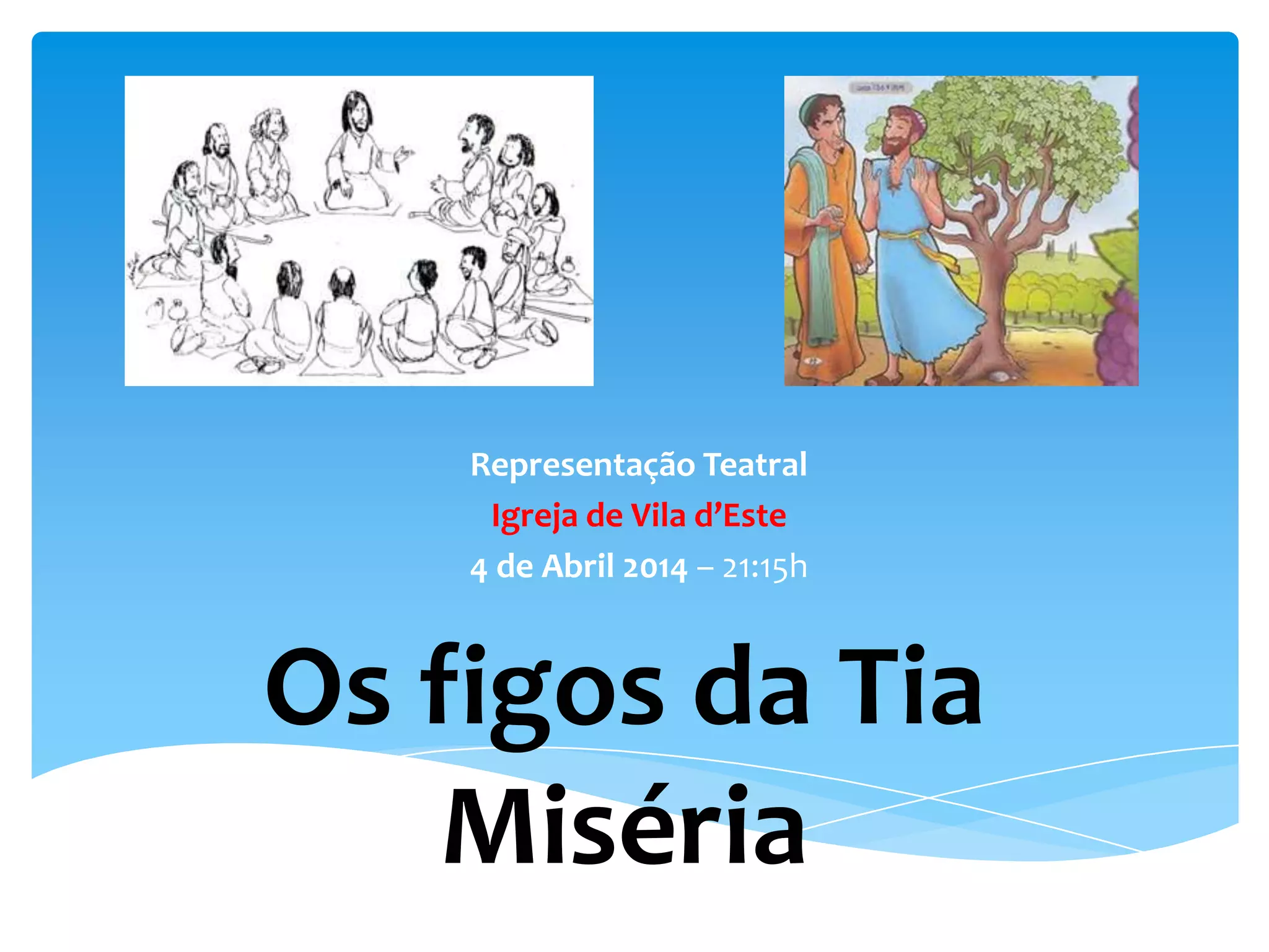 Este documento descreve o programa de uma representação teatral que ocorrerá na Igreja de Vila d’Este em 4 de Abril de 2014 às 21:15h. A peça se chamará "Os figos da Tia Miséria" e incluirá canções como "Tens de dar um pouco mais", "Peregrino aonde vais", "Aonde Deus te levar", "O Senhor é meu pastor" e "Um certo Galileu".