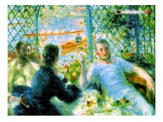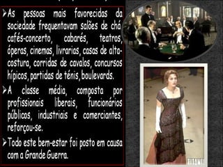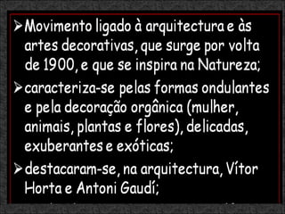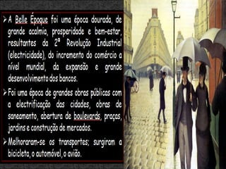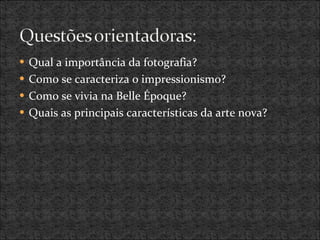 O documento discute a influência da fotografia no impressionismo e as características da Belle Époque e da Arte Nova. O impressionismo foi influenciado pela fotografia ao introduzir novas perspectivas e cores. A Belle Époque foi um período de prosperidade e progresso na Europa. A Arte Nova enfatizava formas orgânicas e fluídas e influenciou a arquitetura, design e artes aplicadas da época.
