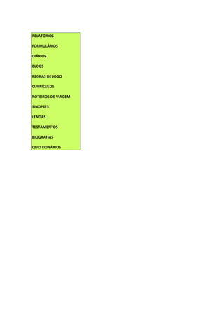 O documento discute os gêneros textuais, definindo-os como grupos de textos classificados por características comuns como estrutura, conteúdo e função social. Ele lista vários gêneros textuais e os agrupa em tipologias com base em traços compartilhados, como textos literários, jornalísticos, científicos, instrucionais e outros. A professora deve considerar quais gêneros circulam no contexto de vida dos alunos e também expandir seu repertório com gêneros menos familiares.