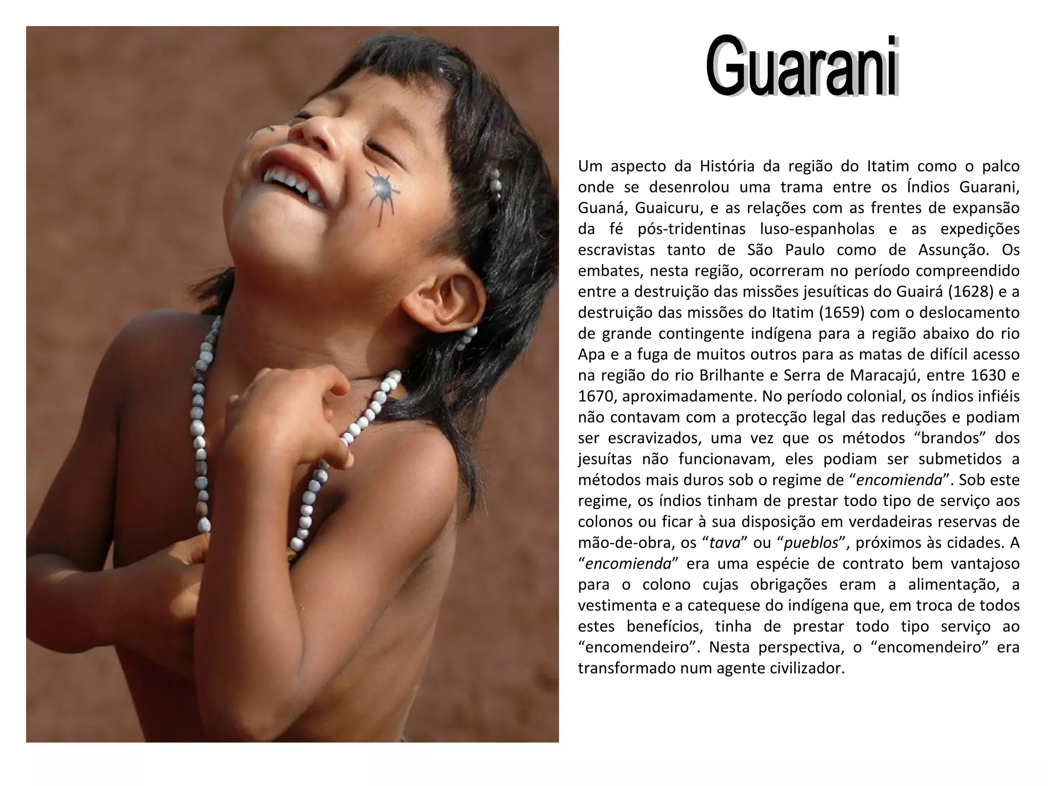 O documento descreve a história da região de Itatim no período entre 1628 e 1670, quando houve embates entre índios Guarani, Guaná e Guaicuru e as frentes de expansão luso-espanholas e expedições escravistas de São Paulo e Assunção. Muitos índios fugiram para matas distantes após a destruição das missões jesuítas. Sob o regime de "encomienda", os índios eram forçados a trabalhar para os colonos em troca de alimentação e catequese.