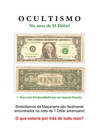 Este documento discute as alegadas atividades secretas da sociedade Illuminati e sua suposta influência na política mundial. Afirma-se que os Illuminati incluem banqueiros, políticos e celebridades e que seu objetivo é estabelecer uma Nova Ordem Mundial através do controle global e da redução da população mundial. O documento também faz referência a símbolos maçônicos encontrados na nota de 1 dólar americano.