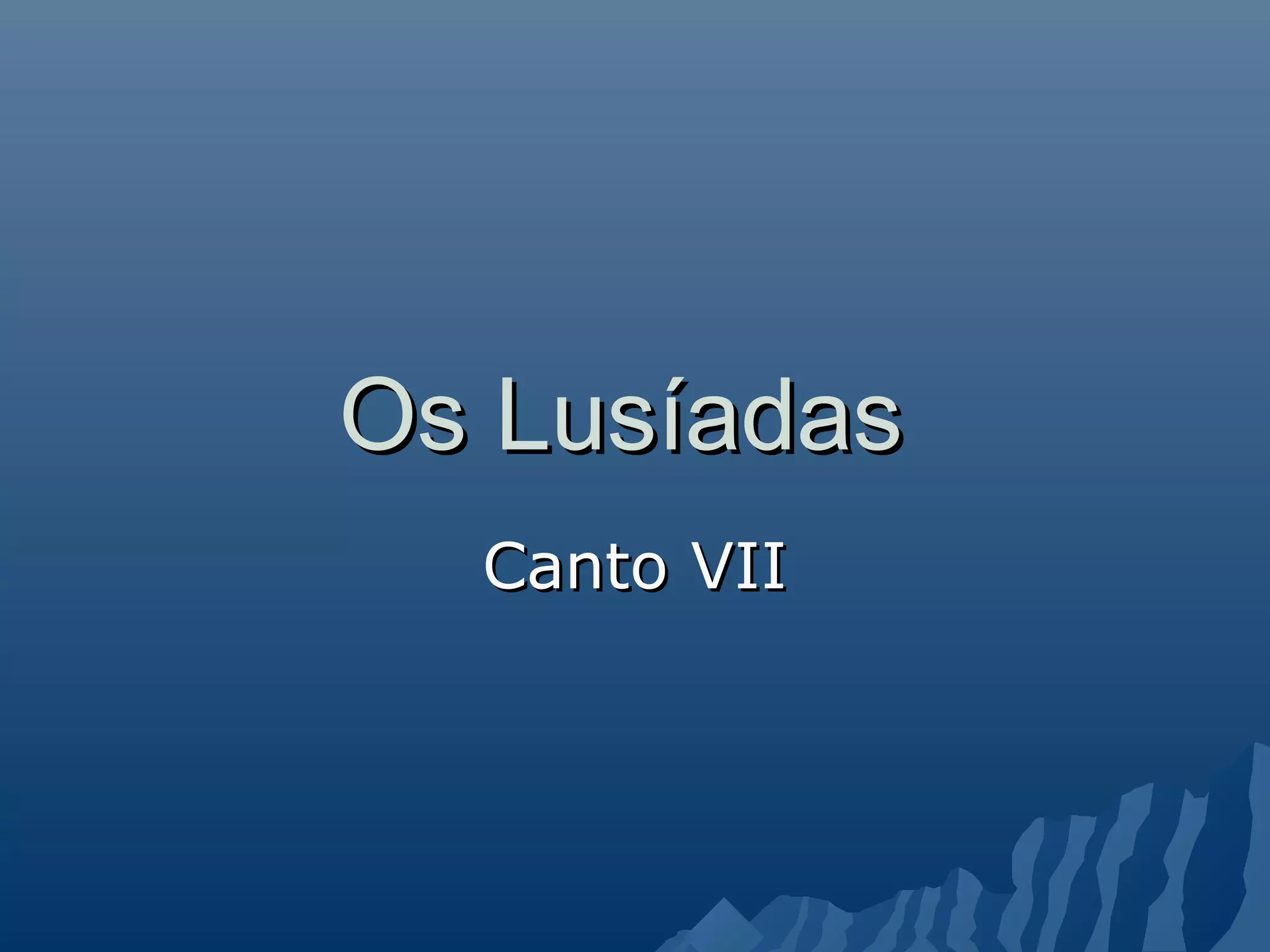 (1) O canto segue narrando a chegada de Vasco da Gama à Índia, especificamente à cidade de Calecute, na costa ocidental do subcontinente. (2) É introduzido o mouro hispânico Monçaide que serve de tradutor aos portugueses e fornece informações sobre a geografia, história e costumes da Índia. (3) Vasco da Gama finalmente consegue audiência com o rei de Calecute, acompanhado de nobres portugueses.