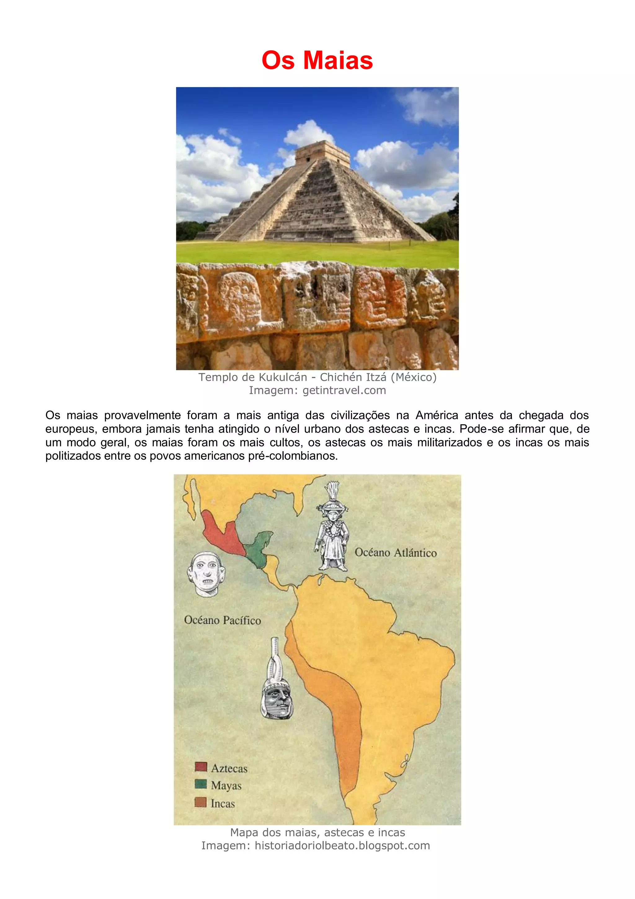 A civilização maia, uma das mais antigas da América, destacou-se por sua arquitetura, conhecimentos em matemática e astronomia, e uma sociedade hierarquizada formada por diversas etnias. Embora tenha atingido seu auge entre 250 e 900 d.C., a cultura maia entrou em decadência no século IX e foi gradualmente conquistada pelo Império Espanhol, com muitos descendentes mantendo tradições até hoje. O sistema de escrita e a matemática maia foram notáveis, abrangendo conceitos como o zero e desenvolvendo calendários mais precisos que o gregoriano.