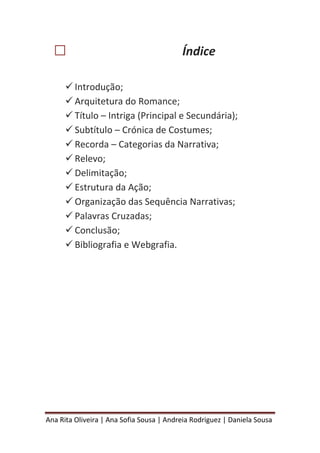 O documento resume os principais pontos do trabalho realizado pelo grupo sobre o romance "Os Maias" de Eça de Queirós. O trabalho aborda a ação da obra, o título e subtítulo, a estrutura narrativa e as categorias da narrativa presentes, como a delimitação da ação, a organização das sequências narrativas e a estrutura da própria ação.