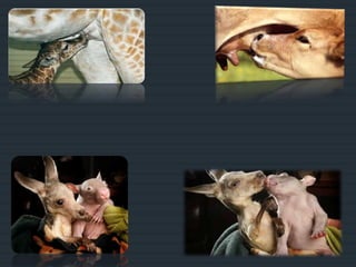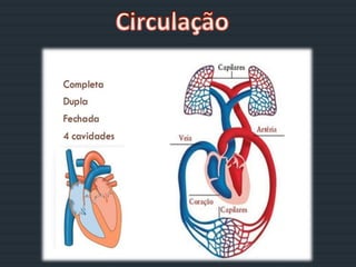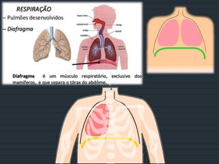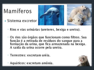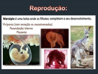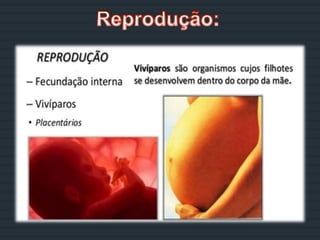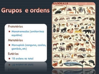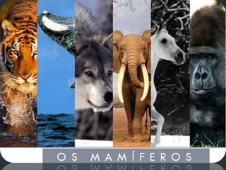 Os mamíferos são animais que se caracterizam por mamar quando filhotes, possuindo glândulas mamárias, pelos e uma estrutura corporal complexa. Eles são homeotermos, vivíparos e habitam diversos ambientes, incluindo terrestre e aquático, apresentando inúmeras variações, como monotremados, marsupiais e cetáceos. Os mamíferos exibem uma diversidade em tamanhos e formas, incluindo espécies como a baleia azul e quirópteros, que são os únicos mamíferos voadores.