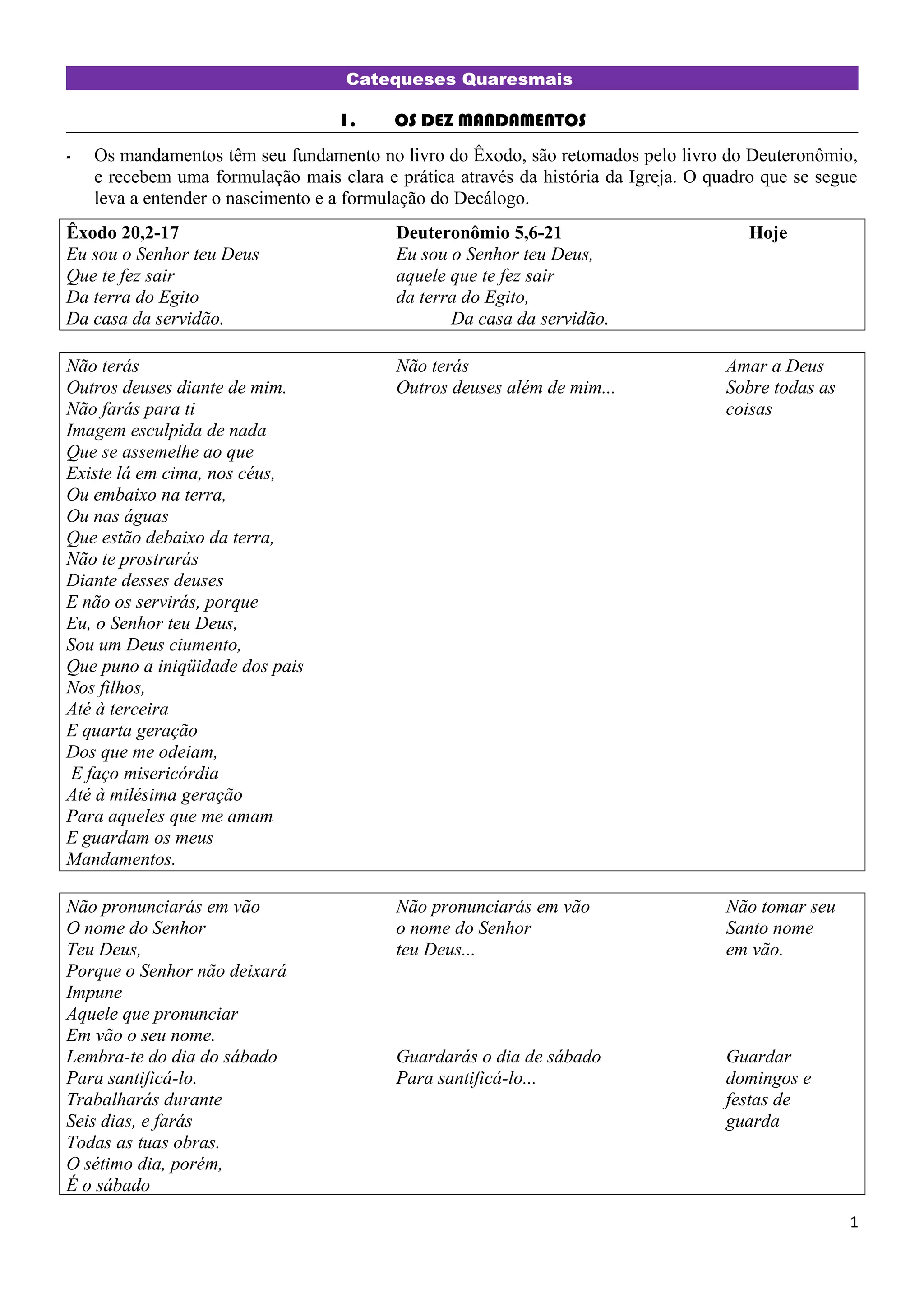O documento discute os Dez Mandamentos, resumindo sua origem bíblica no Êxodo e Deuteronômio e como foram interpretados por Jesus. O primeiro mandamento é o mais importante, exigindo que amemos a Deus sobre todas as coisas.
