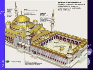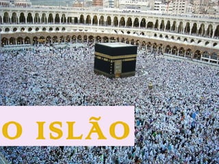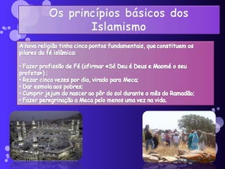 O documento descreve a origem e expansão do Islão, começando com a fundação na Arábia no século VII por Maomé. O Islão se espalhou rapidamente através de conquistas, estabelecendo um grande império que se estendia da Península Arábica à Península Ibérica no século VIII. A reconquista cristã da Península Ibérica começou nas Astúrias no norte no século VIII.