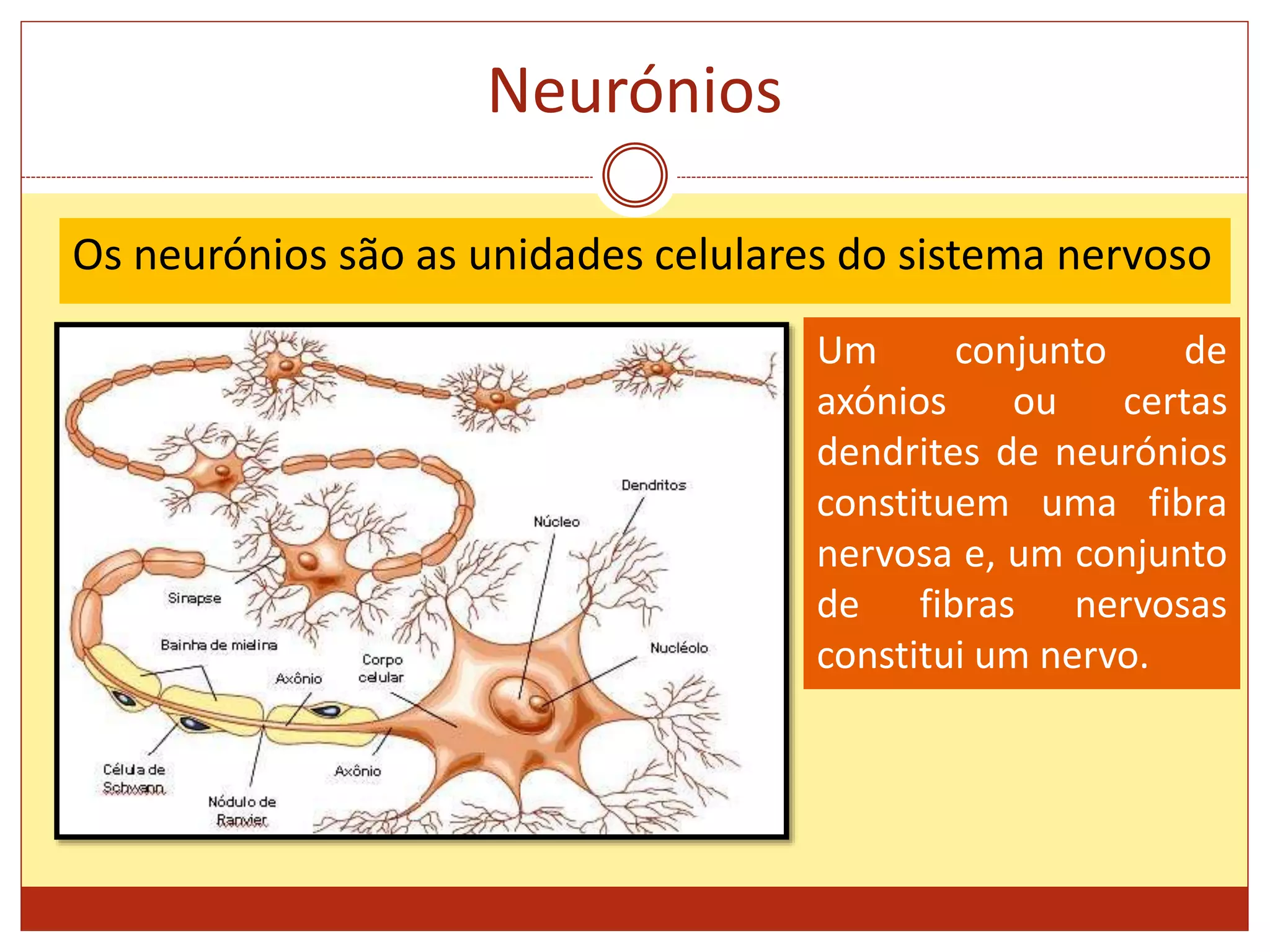 Os neurónios são as unidades celulares do sistema nervoso que transmitem informação através de impulsos nervosos. Existem diferentes tipos de neurónios, incluindo neurónios motores que ativam os músculos, neurónios sensoriais que recebem informação dos órgãos sensoriais, e neurónios conectores que transportam informação de um neurónio para outro.