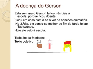 O documento apresenta uma coleção de textos de crianças sobre diferentes temas, incluindo a doença de um colega, um piquenique, férias na Suíça, e as experiências de outono. Os autores compartilham suas vivências e observações, destacando momentos de diversão e apreciação da natureza. O estilo é simples e reflete a perspectiva infantil sobre as atividades e a estação do outono.