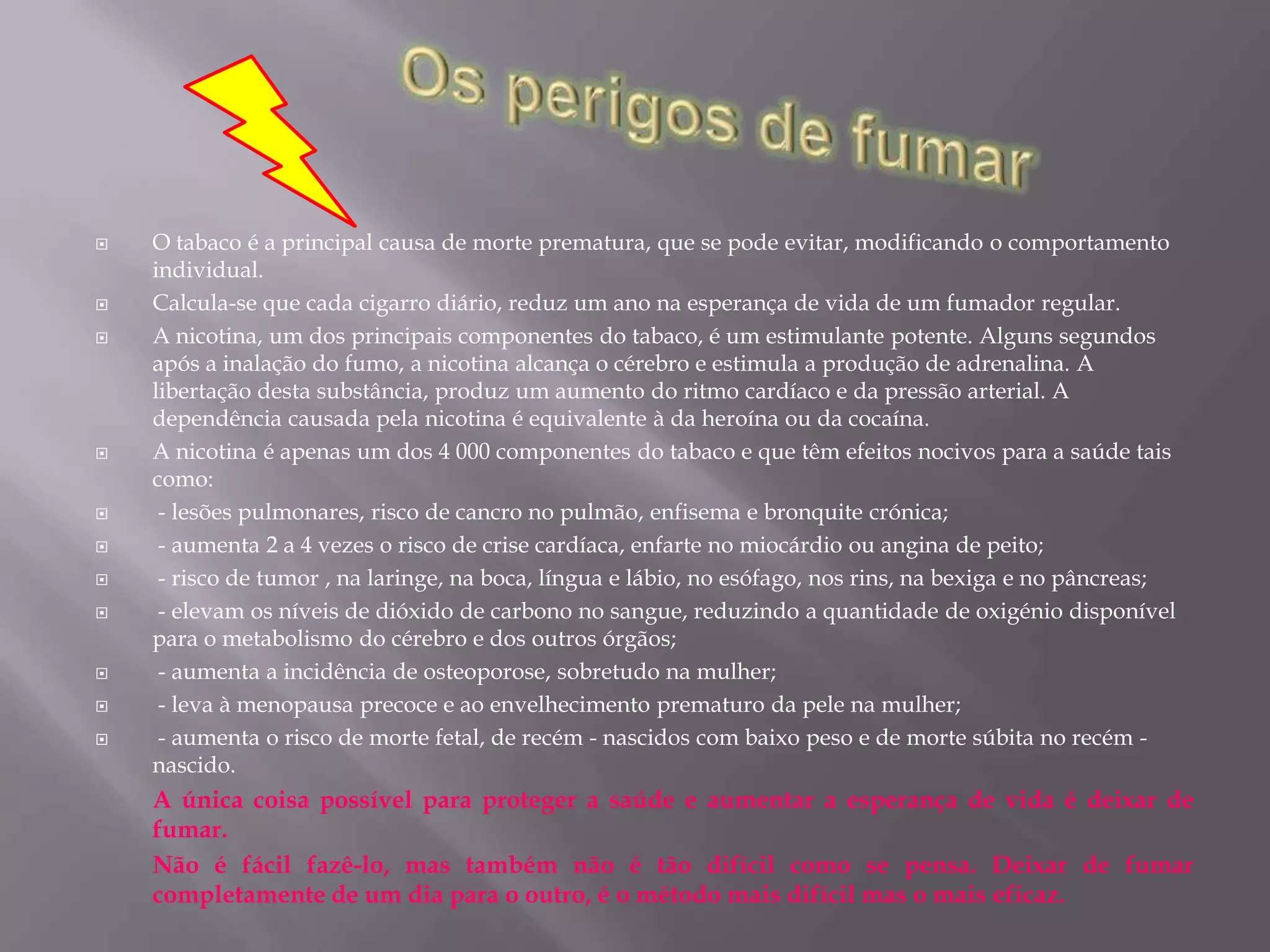 O tabaco é a principal causa de morte prematura evitável e reduz a esperança de vida em um ano para cada cigarro diário. A nicotina no tabaco é altamente viciante e estimula a produção de adrenalina, aumentando o ritmo cardíaco. Deixar de fumar completamente é o método mais eficaz para proteger a saúde e aumentar a esperança de vida, embora não seja fácil.
