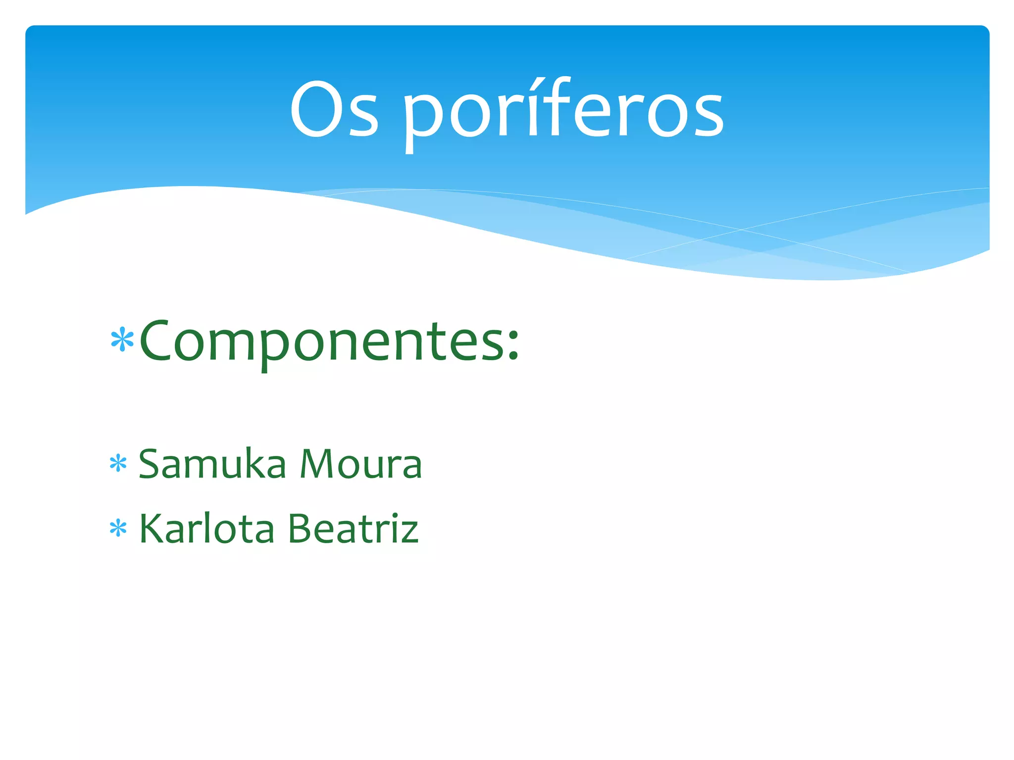 Este documento descreve as características principais dos poríferos. Os poríferos são considerados os primeiros animais a surgirem na Terra e possuem corpos simples sem órgãos internos. Dividem-se em classes como Calcarea, Demospongiae e Hexactinellida. A reprodução ocorre de forma assexuada, através da fragmentação ou gemulação dos corpos.