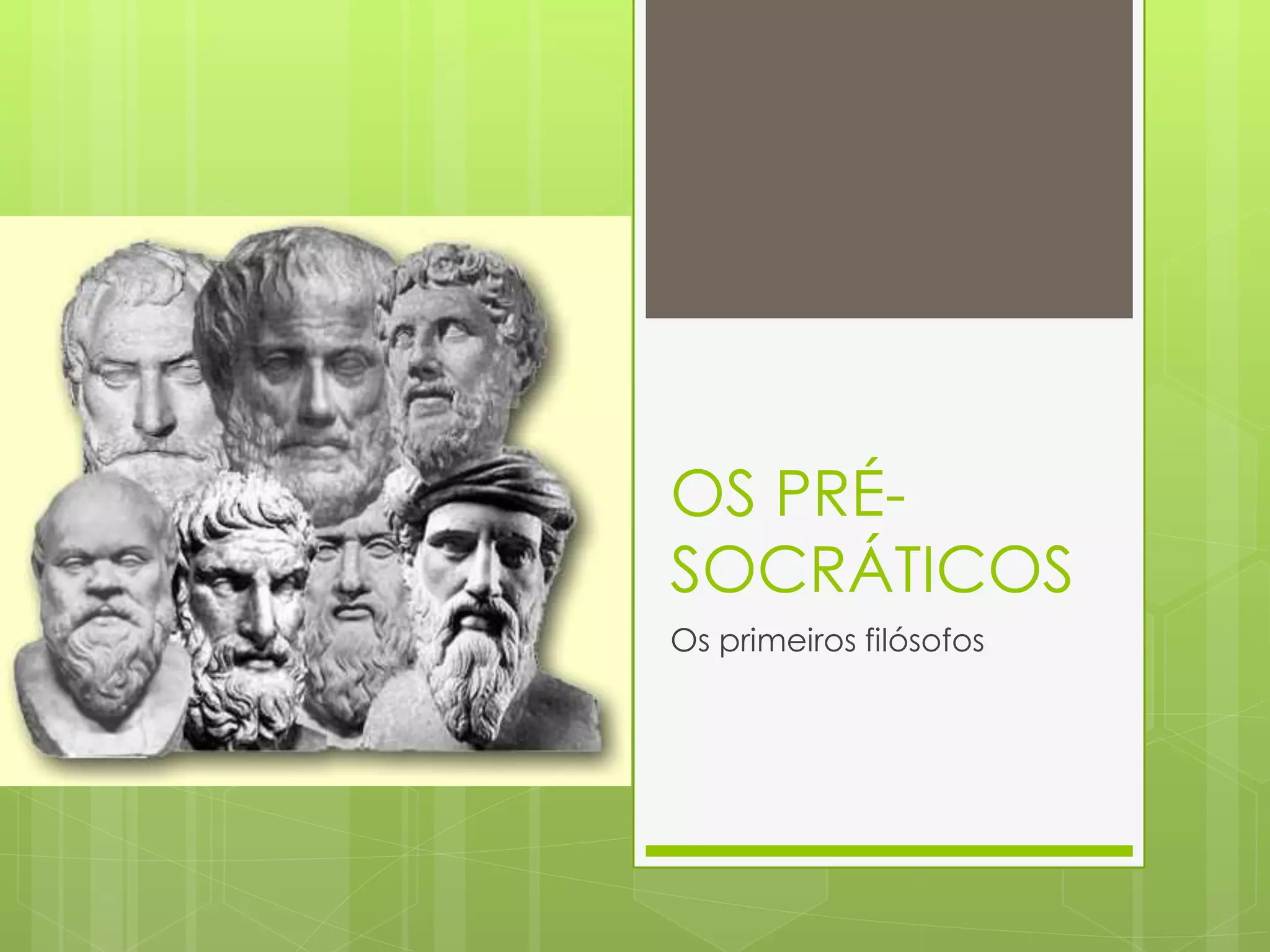 Os pré-socráticos foram os primeiros filósofos gregos que buscaram explicações racionais para os fenômenos naturais, indo além das explicações mitológicas. Eles procuravam a arquê (princípio fundamental) do universo e propuseram diferentes elementos como água, fogo, ar, número e átomo. Sua filosofia era cosmogônica e cosmológica, preocupada com as origens e a lógica do cosmos.