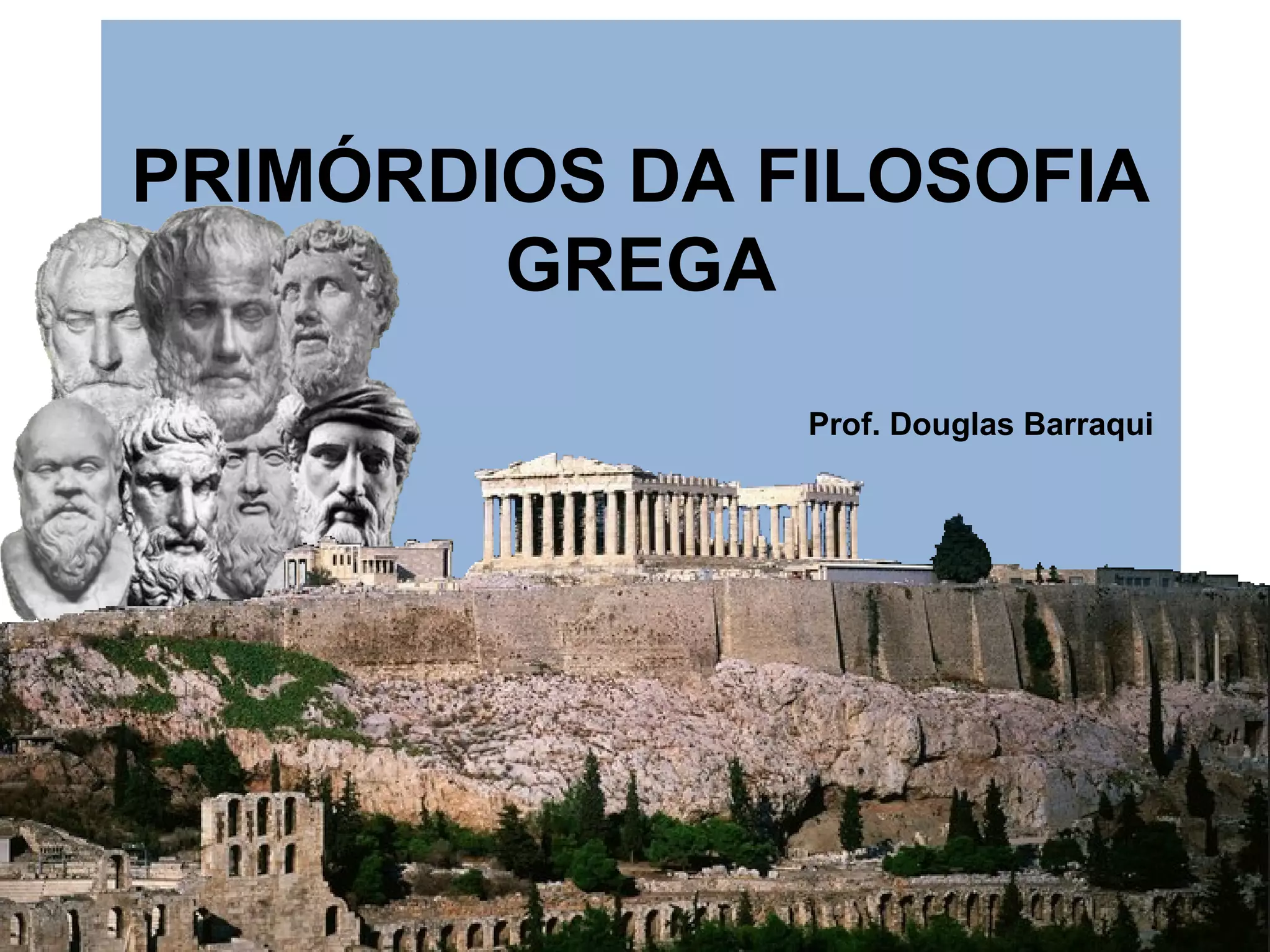 O documento discute os primórdios da filosofia grega, abordando o mito, as funções do mito, o nascimento da filosofia e as condições históricas da Grécia que permitiram seu desenvolvimento. Também apresenta as principais escolas pré-socráticas e os filósofos da natureza, destacando seus principais pensamentos e teorias sobre a origem do cosmos.