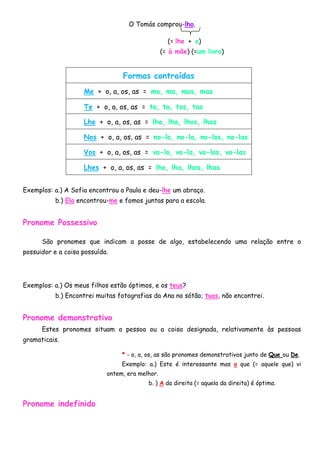 O documento descreve as características e subclasses dos pronomes. Os pronomes substituem nomes ou grupos nominais, variam consoante gênero, número e função sintática, e incluem pronomes pessoais, possessivos, demonstrativos, indefinidos, interrogativos e relativos.