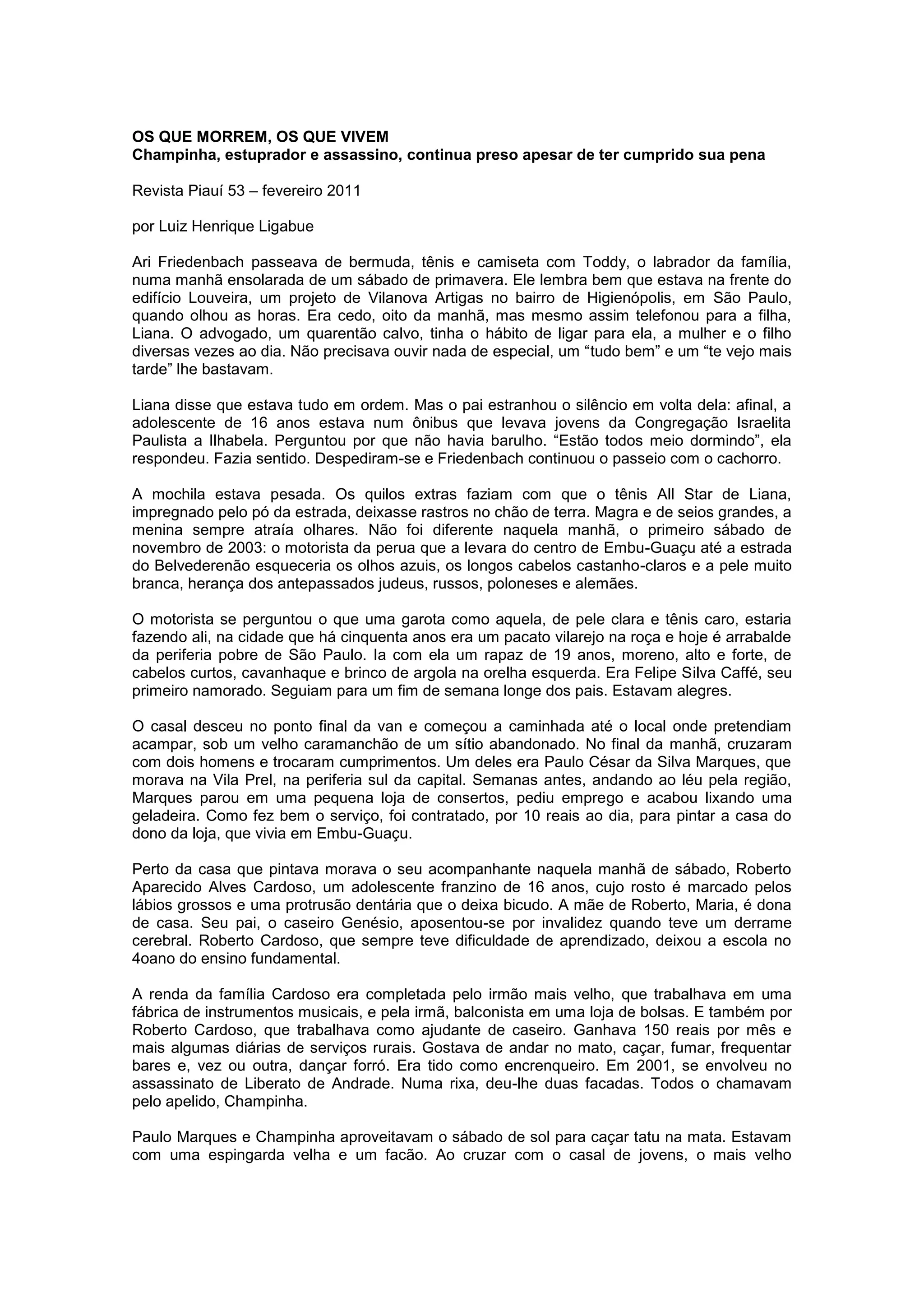 O documento descreve o sequestro, estupro e assassinato de um casal de adolescentes por um grupo de homens em Embu-Guaçu. Champinha, de 16 anos, liderou o crime e estuprou repetidamente a garota de 16 anos. Ele e outros três homens foram condenados, com penas de 6 a 124 anos de prisão. No entanto, após cumprir apenas 3 anos na Fundação do Bem-Estar do Menor, Champinha continua preso por questões de segurança pública.