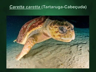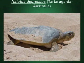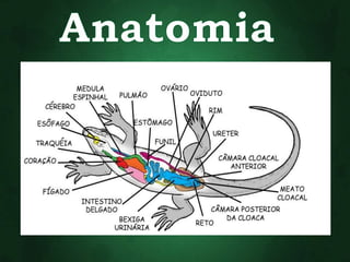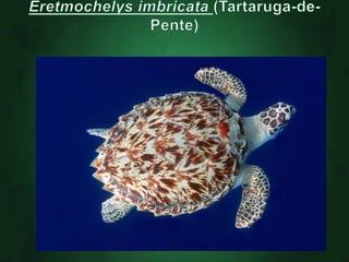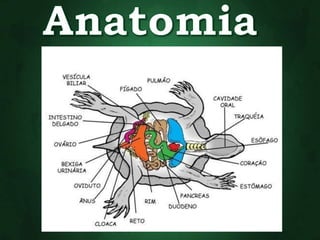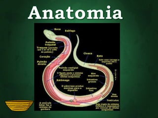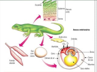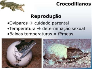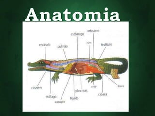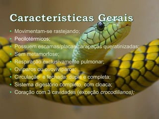 O documento descreve as principais características dos répteis, incluindo que eles se movimentam rastejando, são ectotérmicos, possuem escamas ou carapaças, respiram apenas por pulmões e põem ovos. Alguns exemplos de ordens de répteis extintos são os ictossauros, placodontes e plesiossauros.