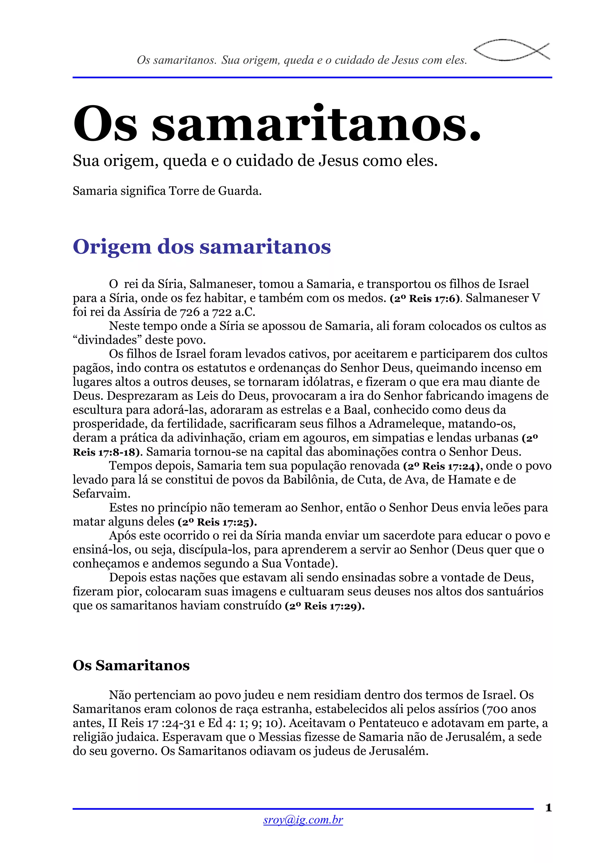 O documento descreve a origem dos samaritanos, como eles adoravam deuses pagãos ao invés do Deus de Israel, e como Jesus teve compaixão e cuidado com eles apesar da divisão entre samaritanos e judeus. Em três frases:
