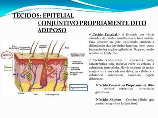 O documento resume os principais tipos de tecidos no corpo humano: epitelial, conjuntivo (derme, adiposo, ósseo, cartilaginoso, sanguíneo), muscular (esquelético, liso, cardíaco) e nervoso. Cada tecido é formado por células específicas e desempenha funções importantes como proteção, sustentação, movimento e transmissão de impulsos nervosos.