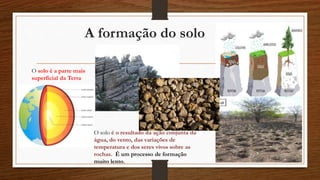 O documento discute os tipos de solo e rochas. Explica que o solo é formado lentamente pela ação da água, vento e temperatura sobre as rochas. Detalha que os solos são classificados como argilosos ou arenosos dependendo de sua permeabilidade e composição. Também descreve as características e usos comuns de diferentes tipos de rochas como granito, calcário e basalto.
