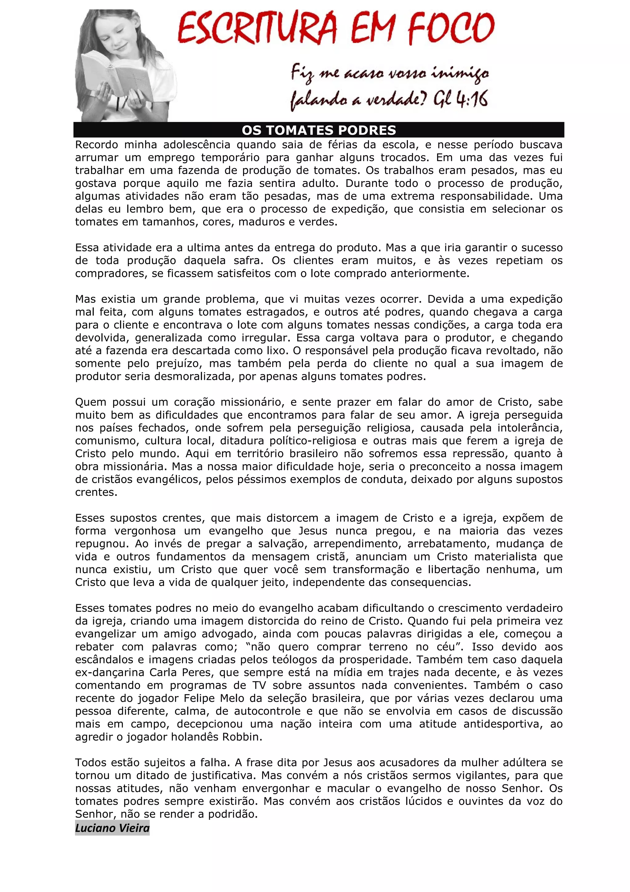 O documento discute como alguns "tomates podres" entre os cristãos podem prejudicar a imagem do evangelho e dificultar o crescimento da igreja. Especificamente, ele menciona como os escândalos e exemplos ruins de alguns supostos crentes podem levar as pessoas a terem preconceitos contra cristãos e distorcer a mensagem de Cristo. O autor argumenta que, embora todos estejam sujeitos a falhas, os cristãos devem ser vigilantes para não envergonhar o evangelho com suas ações.