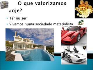 O documento discute os valores da vida moderna versus os valores espirituais. Apresenta exemplos de pessoas que viveram de acordo com valores espirituais como amor, compaixão e simplicidade, como Francisco de Assis. Defende que os verdadeiros valores são aprendidos através da educação moral dentro da família.