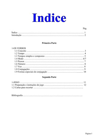 Este documento apresenta um resumo sobre verbos e fornece um jogo para testar os conhecimentos sobre conjugações verbais. A primeira parte discute conceitos como tempo, modo, número, pessoa e voz. A segunda parte descreve as instruções e cartas para um jogo onde os participantes conjugam verbos de acordo com as cartas jogadas.