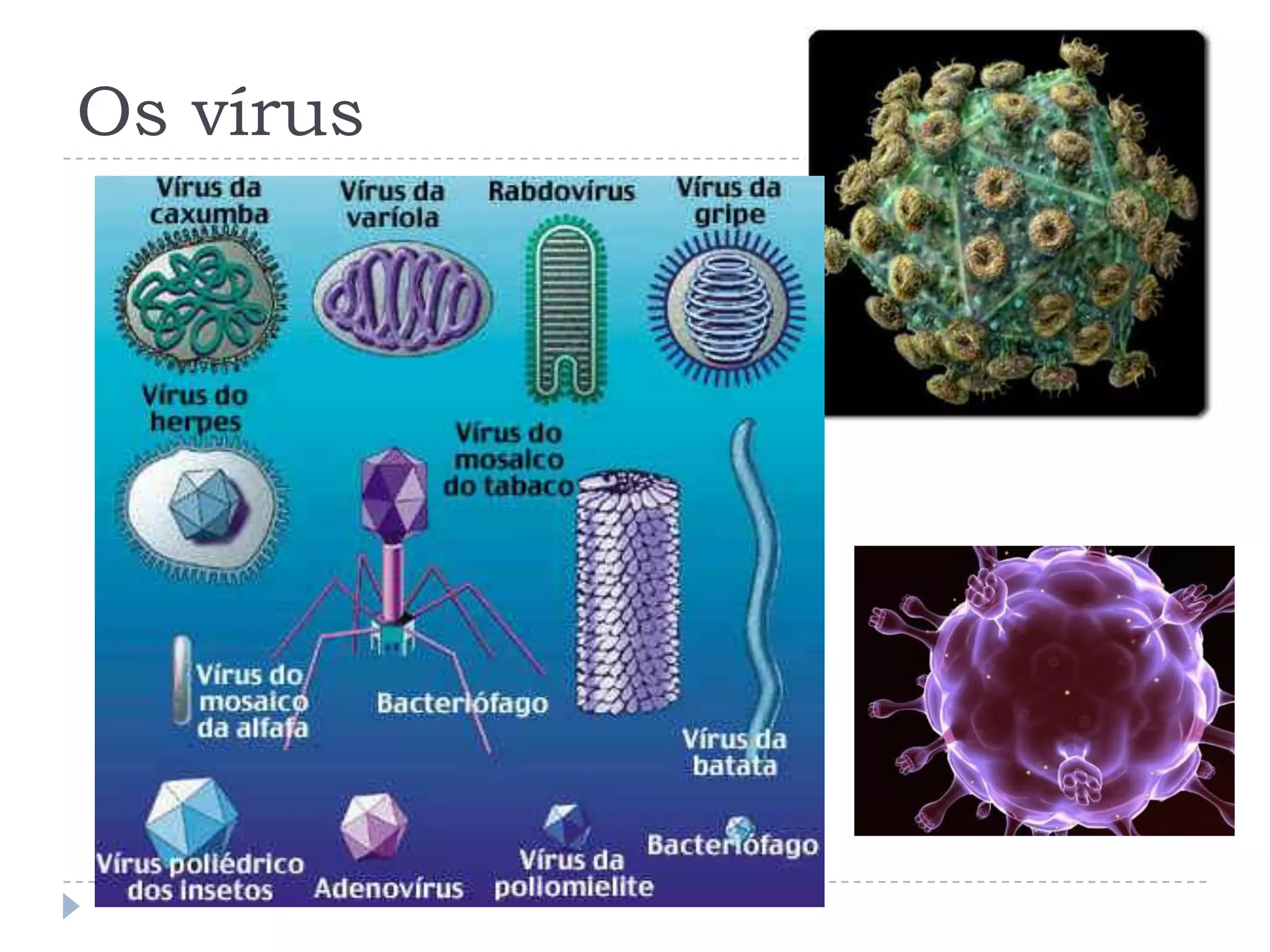 O documento discute a estrutura e reprodução dos vírus. Os vírus possuem material genético e capacidade de mutação, mas não têm organização celular ou metabolismo próprio. Eles podem infectar diversos tipos de células e se reproduzem dentro delas, podendo causar doenças como a hepatite e AIDS. Os principais tipos de vírus incluem os envelopados e não envelopados.