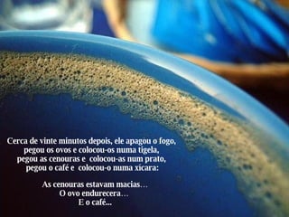 Um chef de cozinha ferve cenouras, ovos e café em panelas separadas para ilustrar como cada um reage à adversidade de forma diferente: as cenouras ficam macias, os ovos endurecem e o café transforma a água. O texto reflete sobre se o leitor é mais como a cenoura, o ovo ou o café quando enfrenta dificuldades.