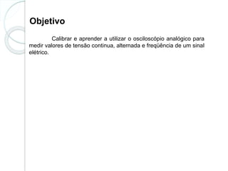 O documento fornece instruções sobre como usar um osciloscópio para medir sinais elétricos. Inclui procedimentos para calibração, ajustes de tela, conexão de pontas de prova e leitura de valores de tensão, frequência e forma de onda. Também apresenta três exercícios práticos para medir diferentes sinais usando o osciloscópio.