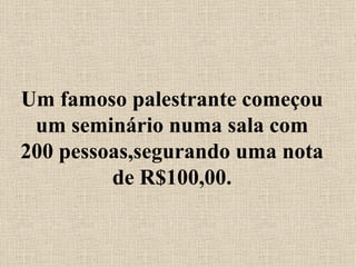 O palestrante segura uma nota de R$100 e pergunta quem a quer, amassando-a e pisoteando-a em seguida. Mesmo assim, as mãos continuam levantadas, ilustrando que nosso valor não depende do que os outros fazem conosco. Ele então pede para lembrar pessoas importantes em nossas vidas, e não famosos, pois são elas que realmente marcam nossa existência.