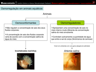 O documento discute os processos de osmorregulação em diferentes ambientes aquáticos e terrestres. Os animais regulam ativamente a concentração de sais e água em seus fluidos corporais por meio de mecanismos como a absorção e secreção nos rins ou brânquias. A osmorregulação é essencial para manter a homeostase interna dos animais.