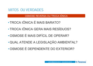 O documento compara as tecnologias de desmineralização de água por osmose reversa e troca iônica, abordando aspectos operacionais, financeiros e ambientais. A osmose reversa é um processo contínuo que gera mais efluentes e requer limpeza mensal, enquanto a troca iônica funciona em batelada e precisa de regeneração diária. Analisam-se custos, eficiência e impactos ambientais de ambas as tecnologias ao longo de cinco anos.