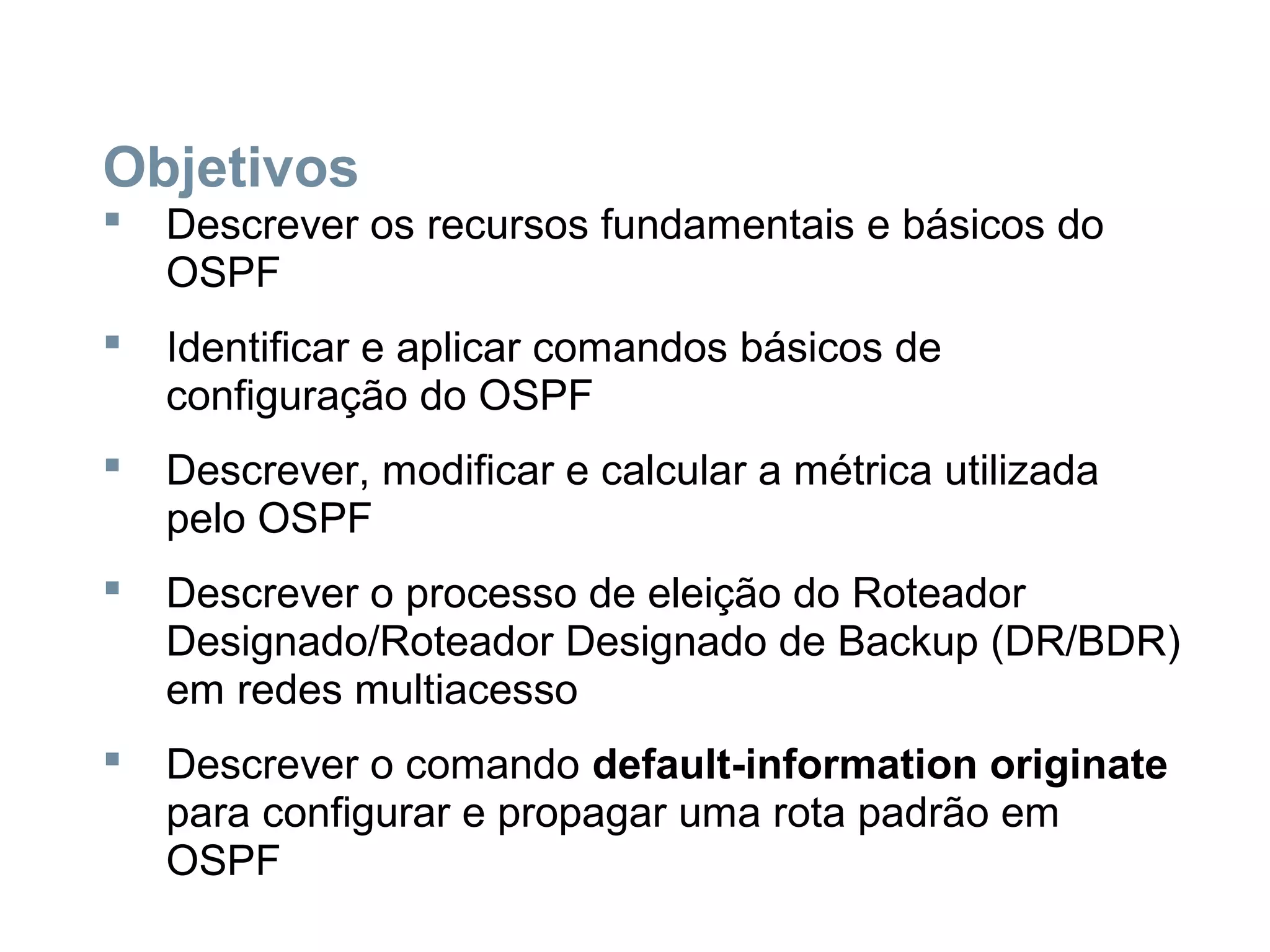 O documento descreve conceitos fundamentais do protocolo OSPF, incluindo objetivos de configuração básica, encapsulamento de mensagens, tipos de pacotes, eleição de DR/BDR, métrica e custo de links.