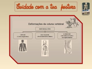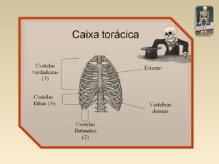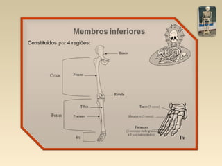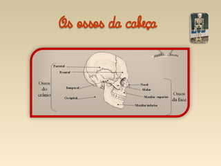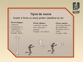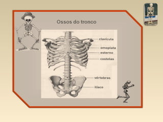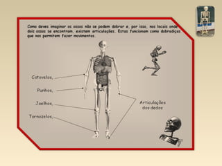 O esqueleto humano é composto por 206 ossos divididos em cabeça, tronco e membros, com funções de sustentação, proteção, movimento e reserva de minerais. O fémur é o maior osso, enquanto o estribo é o menor, localizado no ouvido médio. Tendões, ligamentos e cartilagens também fazem parte do sistema esquelético.