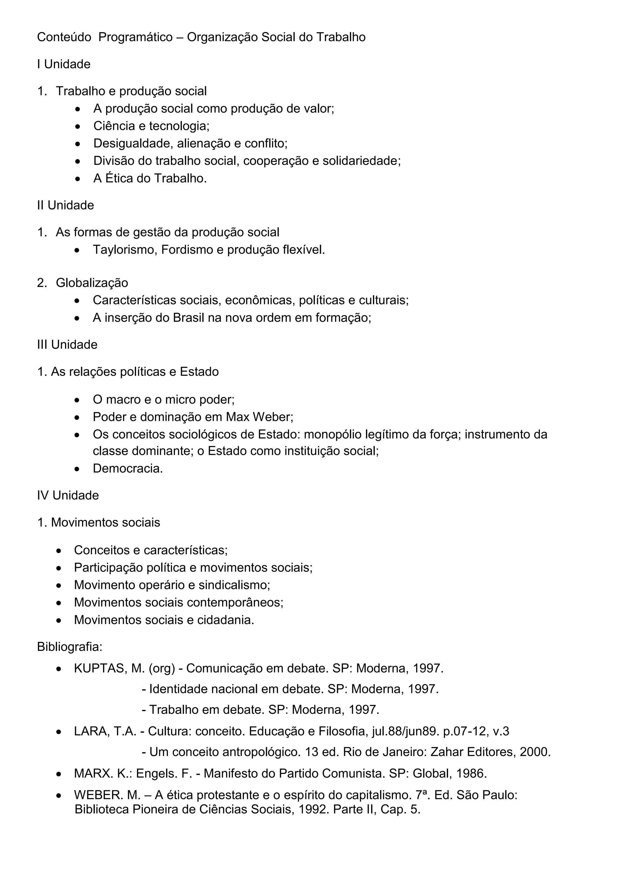 O documento resume os principais tópicos de um curso sobre organização social do trabalho, incluindo: 1) trabalho e produção social, formas de gestão da produção e globalização; 2) relações políticas e conceitos de Estado; 3) movimentos sociais, seus conceitos e participação política. A bibliografia inclui autores como Marx, Engels, Weber e Lara sobre esses temas.