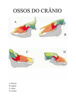 Este documento fornece detalhes sobre os ossos da cabeça humana, incluindo os ossos do crânio, da face e da mandíbula. Também descreve o aparelho hióide e os principais ossos do corpo, como os ossos axiais, do membro torácico e da mão.