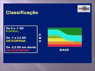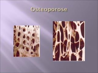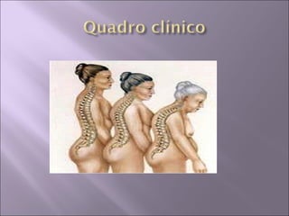 A osteoporose é uma doença óssea caracterizada pela perda de massa óssea e fragilidade óssea, levando a um aumento no risco de fraturas. A densitometria óssea por absorciometria de raios X de dupla energia (DEXA) é o método padrão-ouro para diagnóstico, enquanto a biópsia óssea fornece informações sobre a microarquitetura óssea. O tratamento visa prevenir novas fraturas por meio de suplementação de cálcio, vitam