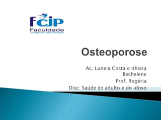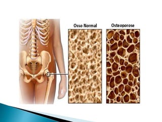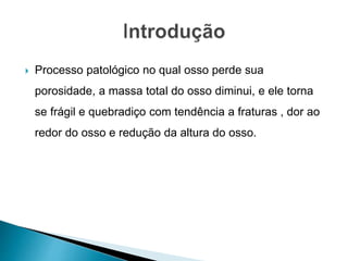 O documento descreve a osteoporose, um processo patológico que causa fragilidade óssea e fraturas. Ele explica as causas, fatores de risco e sintomas da osteoporose, além das estratégias de prevenção, tratamento e impacto na saúde da população idosa.