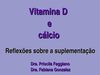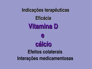O documento discute a fisiologia do osso, a vitamina D e o cálcio, e reflexões sobre a suplementação destes. A suplementação pode inibir a autorregulação da ativação da vitamina D e causar efeitos adversos como hipercalcemia. Interações medicamentosas também são possíveis.